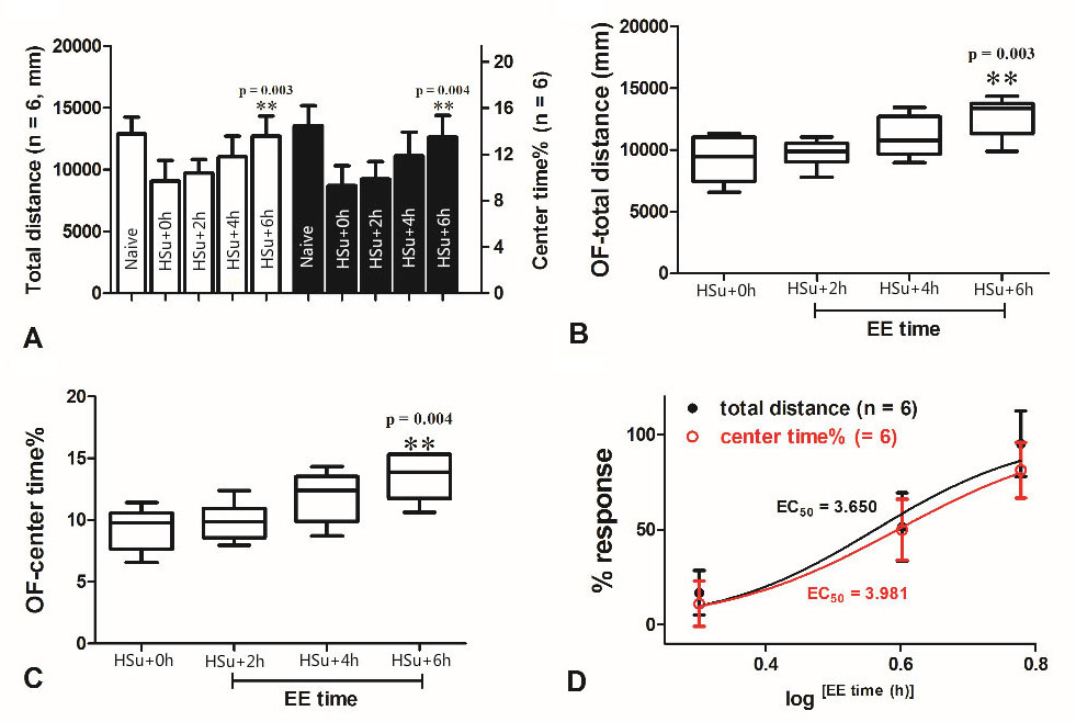 Figure 1Enriched environment ameliorates prediabetes induced anxietylike behavior in the open field (OF), in a time-dependent manner. (A) indicates the average of the total distance (mm) travelled by study rats in the dark open field box and total time of their stay at the center of the dark open field box; (B) indicates the median of the total distance (mm) travelled by study rats in the dark open field box; (C) indicates the median of the total time of stay by the study rats at the center of the dark open field box; (D) indicates the EC50 of the enriched environment for the total distance travelled and total time of stay at the center of the dark open field box; ** p<0.0.1; * p <0.0.5, compared with HSu+0 h.