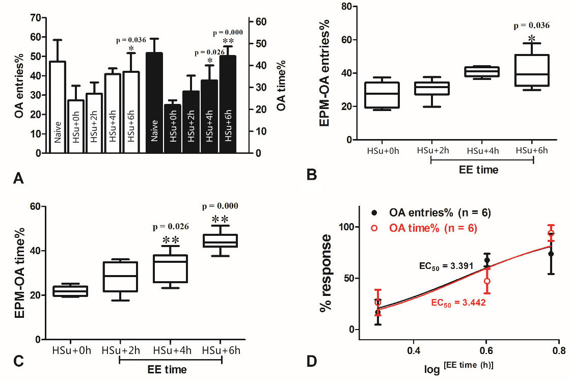 Figure 2Enriched environment ameliorates prediabetes induced anxietylike behavior in the elevated plus maze (EPM) test, in a time-dependent manner. (A) indicates the average of the percentage (%) of the number of times the study rat enters open arm and the total time of stay in the open arm of the elevated plus maze; (B) indicates the median of percentage (%) of the number of times the study rat enters the open arms of the elevated plus maze (C) indicates the median of the percentage (%) of the total time of stay in the open arm by study rats in the elevated plus maze (D) indicates the EC50 of the total number of entries into the open arm of the elevated plus maze and the total time of stay in the same by the study rats; ** p<0.0.1; * p <0.0.5, compared with HSu+0 h.