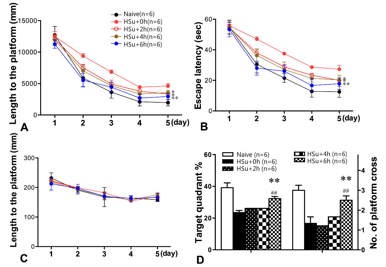 Figure 3Enriched environment ameliorates prediabetes induced impairment in the spatial learning/memory in a time-dependent manner as demonstrated by the morris water maze (MWM) test. (A) indicates the total distance covered by the study rats to reach the platform; (B) indicates the escape latency of the study rats; (C) indicates the total distance covered by the study rats to reach the platform within the target quadrant; (D) indicates the percentage of time spent in the target quadrant and the number of times the study rats cross the platform zone; ** p<0.0.1; * p<0.0.5, compared with HSu+0 h.