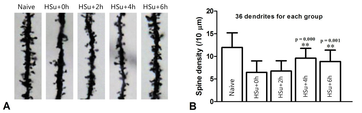 Figure 1Enriched environment restores abnormal hippocampal pyramidal dendritic structural plasticity in a time-dependent manner. (A) indicates the hippocampal CA1 neuronal dendrites and their dendritic spines; (B) indicates the hippocampal CA1 neuronal dendritic spine density; ** p <0.0.1; * p<0.0.5, compared with HSu+0 h.