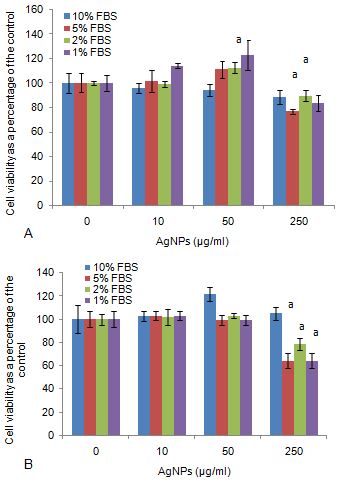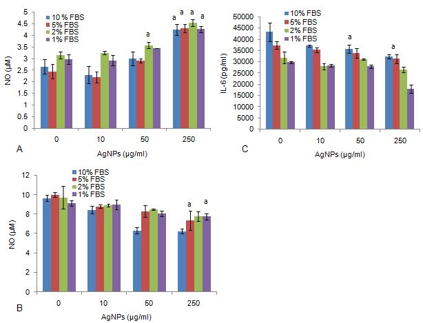 Due to the uncertainty of final FBS concentrations of cells exposed to AgNPs (3, 8, 19, 20), as a preliminary evaluation in this study, RAW cells were exposed to various AgNP concentrations, 10, 5, 2, and 1 % FBS and either in the absence or presence of LPS. The highest FBS concentration, 10%, aided in protecting the cell from the cytotoxic and anti-inflammatory (NO) effects of the AgNPs.