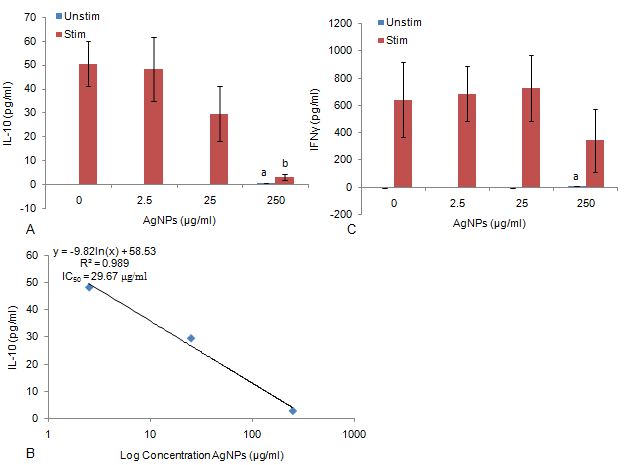Figure 10Synthesis of acquired immune system biomarkers (a) IL-10 synthesis of WBCs exposed to AgNPs in the absence or presence of PHA, (b) IC50 determination of AgNPs on IL-10 production by PHA stimulated WBCs, (c) IFNγ synthesis of WBCs exposed to AgNPs in the absence or presence of PHA . Data represents mean ± SD with n = 4. Bars marked with letters indicate significant difference to 0 μg/ml AgNPs (P < 0.0.1). Significance demarcated by: significantly different compared to negative control, 0 μg/ml AgNPs (-PHA) (P < 0.0.01); b- significantly different compared to positive control, 0 μg/ml AgNPs (+PHA) (P < 0.0.01).