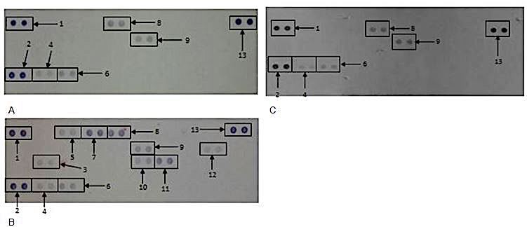 Figure 11The effect of AgNPs on WBCs. Cells were incubated with (a) medium only, (b) medium containing LPS or (c) 25 μg/ml AgNPs in the absence of LPS. Supernatants were probed using the proteome profiler array as described in methods. Cytokines/ chemokines that were detected were allocated numbers: 1,2, and 13 are reference spots; 4- MIF; 6- Serpin E1; 8- RANTES; 9-ICAM-1.