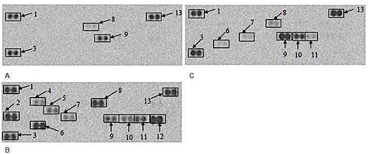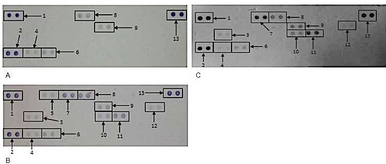 Figure 5The effect of AgNPs on RAW 264.7 cells. Cells were incubated with (a) medium only, (b) medium in the presence of LPS or (c) 250 μg/ml AgNPs in the presence of LPS. Supernatants were probed using the proteome profiler array as described in methods. Cytokines/ chemokines that were detected were allocated numbers: 1,3,and 13 are reference spots; 2-CXCL10/CRG-2/IP-10; 4- G-CSF; 5- IL-6; 6- TNF-α; 7- CCL2/MCP-1/JE; 8- CD54/ sICAM-1; 9- CCL3/MIP-1α; 10- CCL4/MIP-1β; 11- CXCL2/MIP-2; and 12-CCL5/RANTES.
