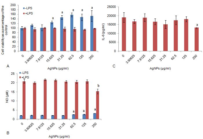 Figure 3Monitoring (a) cellular metabolic activity of RAW 264.7 cells in the absence and presence of LPS, (b) NO production in the absence and presence of LPS and (c) IL-6 production by RAW 264.7 macrophage cells exposed to AgNPs in LPS stimulated cell cultures. Data represents mean ± SD with n = 9. Unstimulated cultures did not synthesize IL-6 (data not presented). Bars marked with letters indicate significant difference to control (P < 0.0.1). Significance demarcated by: a- significantly different compared to 0 μg/ml AgNPs (-LPS) (P <0.0.01), b- significantly different compared to 0 μg/ml AgNPs (+LPS) (P < 0.0.01).