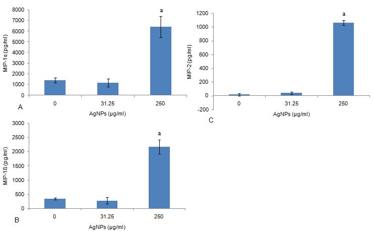 Figure 6The effect of AgNPs exposed to RAW cells not stimulated by LPS. The quantification of the effects of AgNPs on the secretion of the chemokines: a) MIP-1α, b) MIP-1β and c) MIP-2. Data is presented as mean ± SD with n = 9. Bars marked with letters indicate significant difference to control (P < 0.0.1). Significance demarcated by: a- significantly different compared to the control (P < 0.0.01)