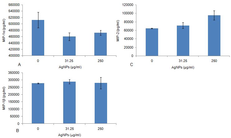 Figure 7The effect of AgNPs exposed to RAW cells stimulated by LPS. The quantification of the effects of AgNPs on the secretion of the chemokines: a) MIP-1α, b) MIP-1β and c) MIP-2. Data is represented as mean ± SD with n = 9.