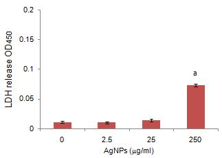 AgNP concentrations ≤ 25 μg/ml did not affect cell viability (Figure 8). However, the highest concentration of AgNP (250 μg/ml) significantly reduced (P < 0.0.01) cell viability compared to the culture control.