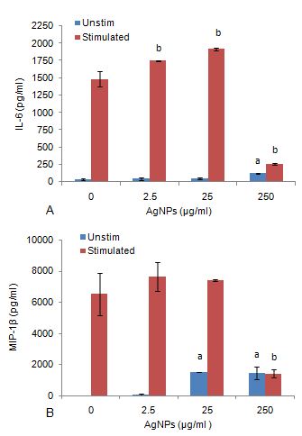 Figure 9Synthesis of biomarkers associated with inflammation, (a) IL-6 synthesis of WBCs exposed to AgNPs in the absence and presence of LPS, (b) MIP-1β synthesis of WBCs exposed to AgNPs in the absence and presence of LPS . Data represents mean ± SD with n = 4. Bars marked with letters indicate significant difference to 0 μg/ml AgNPs (P < 0.0.1). Significance demarcated by: a- significantly different compared to negative control, 0 μg/ml AgNPs (-LPS) (P < 0.0.01); b- significantly different compared to positive control, 0 μg/ml AgNPs (+LPS) (P < 0.0.01).