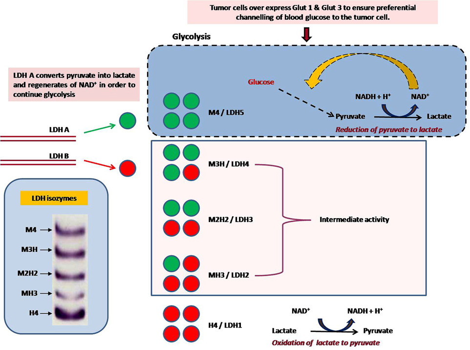 Figure 1Overproduction of lactate is a hallmark of cancer cells. In tumors it can act as an alternate metabolic fuel and also as signalling molecule. The secreted lactate lowers pH of the cellular matrix and helps stimulate angiogenesis and metastasis. Lactate is produced exclusively by LDH. LDHs catalyze interconversion of pyruvate lactate, with concomitant interconversion of NADH and NAD+. M4-LDH (LDH-5, LDH-A) and M3H LDH preferentially convert pyruvate to lactate, and thereby prevents entry of pyruvate to the TCA cycle. This reaction regenerates the cofactor NAD+ and, therefore, permits glycolysis as a self sustained pathway. Thus, up-regulation of LDH-A alone alone can ensure efficient glycolysis in the tumour cells.