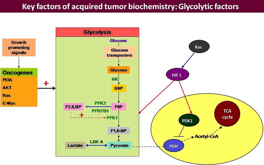 Figure 2Tumor cells over express HIF-1a and initiate a transcription programme to up-regulate glucose metabolizing genes and all the enzymes of glycolytic pathway. Tumor cells over express Glut 1 and 3 to ensure preferential channelling of blood glucose to the tumor cell. There are three rate limiting enzymes of glycolytic pathway: HK II, PFK1 & PK and all of them have been reported to be over activated in the tumor cells. Amongst them, PFK1 occupies a sensitive position because it is regulated by another enzyme PFK2/FBPase 2 which is exclusive for the conditions of additional glycolytic demand, including carcinogenic progression. 6-phosphofructo-2-kinase/fructose-2,6-bisphosphatases (PFKFB) are bifunctional enzymes that catalyze either the ATP-dependent phosphorylation of F6P to F2,6BP (PFK2 activity) or the dephosphorylation of F2,6BP to F6P (FBPase activity). The PFKFB family comprises four members among which PFKFB3 is more important because it has high PFK2 but almost no FBPase activity. PFKFB3 sustains high-rate of glycolysis and is highly expressed in several types of human tumors and down regulation of PFK2 has been correlated with regression of certain tumors in vitro. F2,6BP and PFKFB3 are the main allosteric activator of PFK1 and exerts an important contribution to the glycolytic switch.