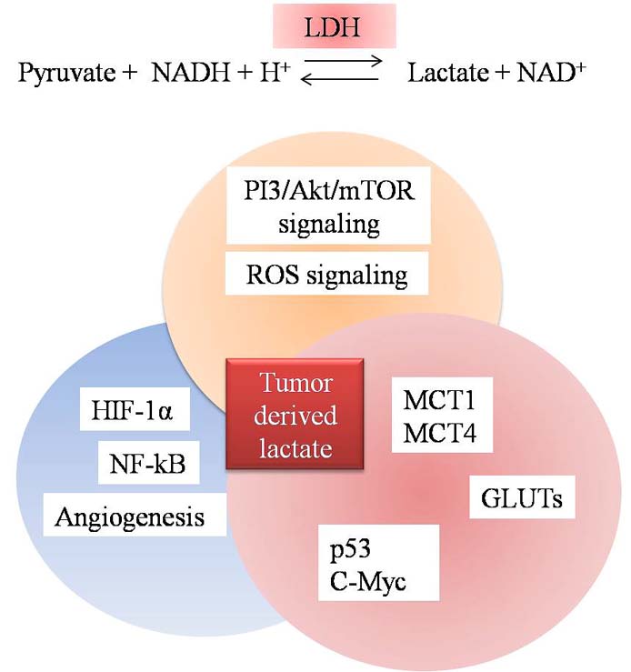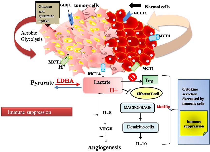 Metabolic impairment is a signature of cancer cells, but there is lack of understanding about the fate of lactate signaling in tumors emerging in their local microenvironment. Lactate also plays significant role in encouraging inflammation in tumor and stimulating angiogenesis in cancer cells (1). In 1924 Otto Warburg found the insightful differences between metabolic pathways of normal cells and cancer cells but misunderstood that phenomenon as mitochondrial dysfunction. For rapid generation of ATP, cancer cells choose aerobic glycolysis whereby consequently glucose is catabolized to lactate instead of going to TCA cycle for mitochondrial oxidative phosphorylation (2). For regulation of redox homeostasis, cancer cells use glutamine catabolism which helps to support anabolic growth, and maintain intermediates of TCA cycles which helps in proliferation of cancer cells (3). The solid tumors and cancer cells maintain extracellular acidity because of high lactate production and to maintain metabolism, tumor cell must drive out lactate from the cell, which they do via transporters called as monocarboxylate transporters (MCTs) meant for H+ coupled lactate efflux. Generally cancer cells are hypoxic and they use glucose for rapid energy production and release lactate which is further utilized by oxygenated cancer cells (4). Glycolysis in hypoxic condition results into lactic acid production (5). Studies in 1980s described that muscle and brain tissues are proficient in oxidizing lactate as a substrate for energy production and scientific community was puzzled whether can lactate serve as bioenergetic tool? (6).