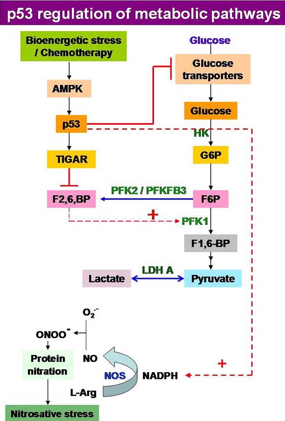 Several mechanisms have now been reported through which p53 can slow glycolysis and therefore counteract the increase in glycolysis that is characteristic of cancers. It can reduce glucose uptake, by repressing transcription of the glucose transporters GLUT1 and GLUT4 (73) and declines glycolysis by activating the TIGAR gene which lowers fructose-2,6-bisphosphate and phosphoglycerate mutase levels in cells (69), with a concomitant stimulation of NADPH generation leading to the diversion of glucose through the pentose phosphate pathway (74), thus impeding flux through various steps of the glycolytic machinery (Figure 4).