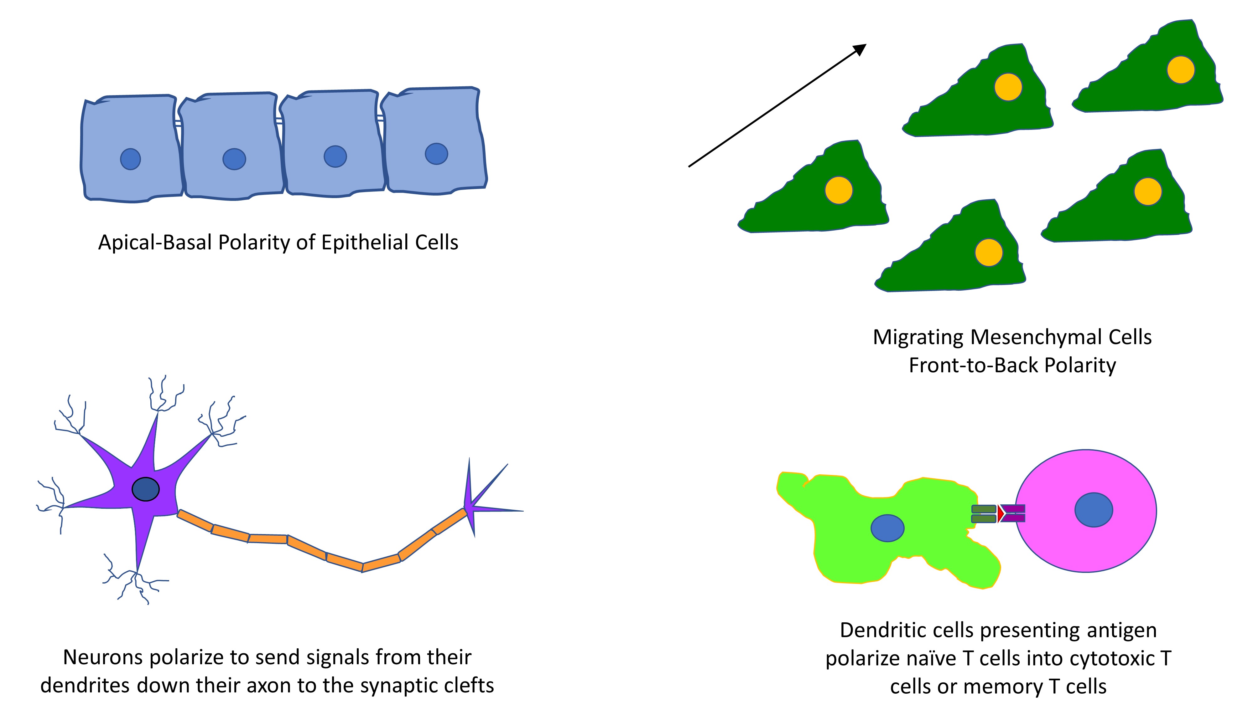 Figure 1Cell polarity plays a critical role in cell function. A prime example is the epithelial cells utilizing apical-basal polarity to provide a barrier function against pathogens. Another example is cell migration which requires front-to-back polarity to allow cells to adhere to and detach from the ECM. Polarity is also required for neurons to perform their task of propagating action potentials and sending messages from the central nervous system to distant body parts.