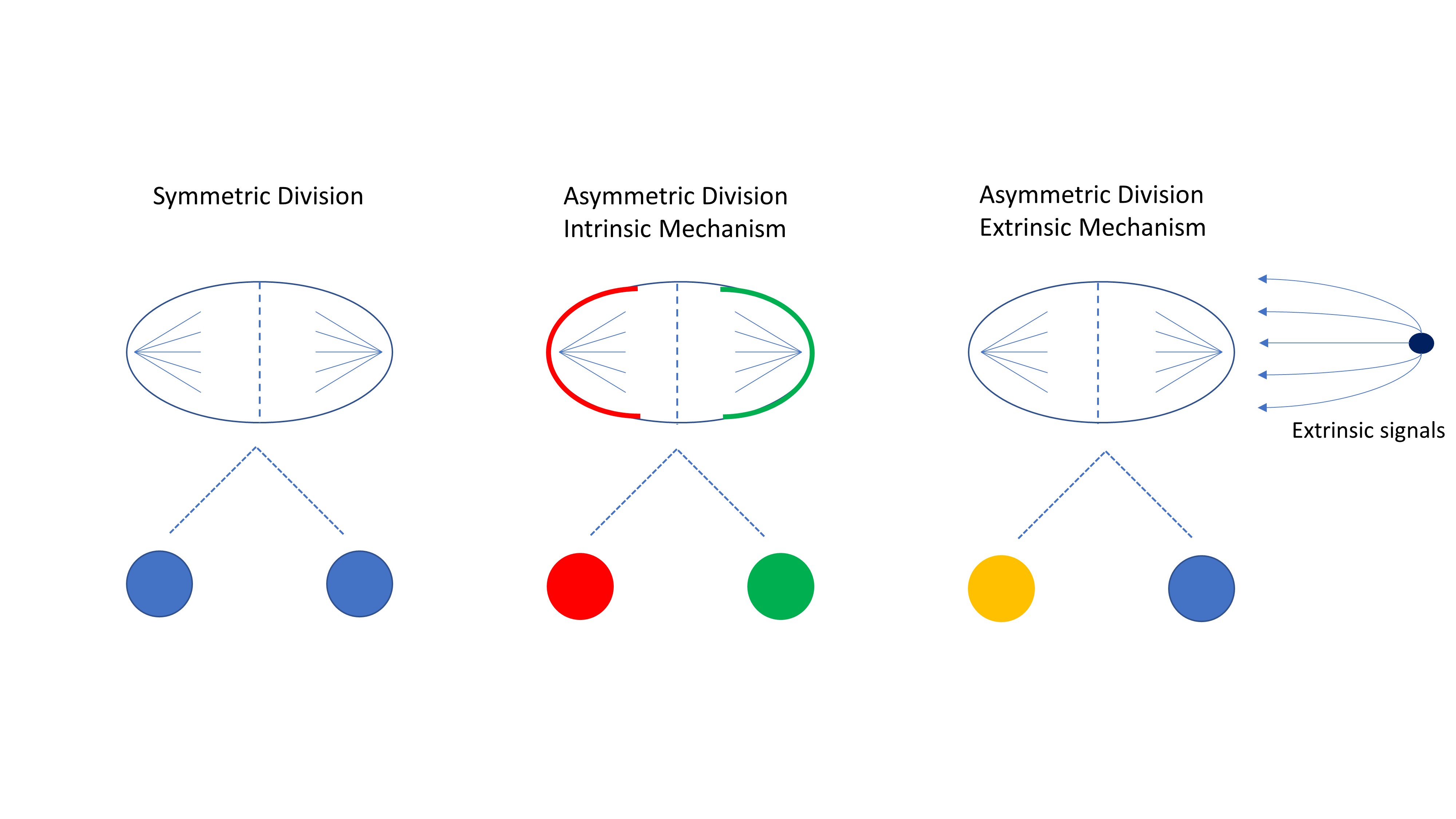 Figure 2Cell divisions are controlled by internal and external signals. Symmetric divisions occur when there is an equal distribution of proteins, organelles, and cytoskeleton in the mother cell resulting in two daughter cells of the same fate. Asymmetric divisions through the intrinsic mechanism have an unequal distribution of proteins and fate determinants often resulting in daughter cells with different fates. Through the extrinsic mechanism, the cell divides symmetrically but daughter cells receive different signals from the microenvironment resulting in diverse cell fates.