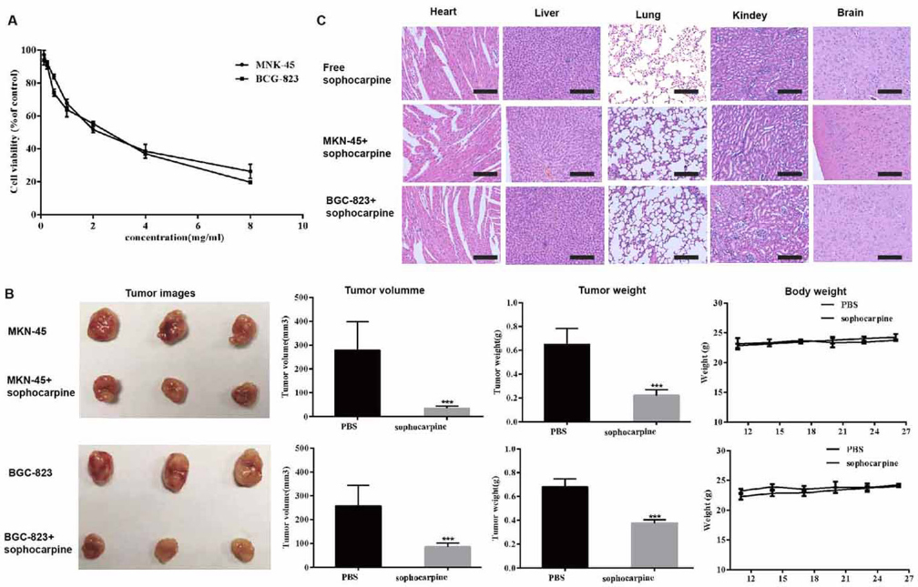Figure 1The cytotoxicities of sophocarpine on MNK45 and BGC-823 cell lines. (A) Cell viabilities of MNK45 and BGC-823 cells measured by CCK-8 assay, after the treatment of different concentrations of sophocarpine for 48 h. (B). The tumor images, volume, weight and the body weight of the nude mice after treatment for 26 days. (C). H&E staining analysis of the main organs (heart, liver, lungs, kidneys, and brain) in three groups. All data are shown as the mean ± SD, n=3. *p < 0.05, **p < 0.01, or ***p < 0.001, versus the control group. Scale bar was 50 μm.