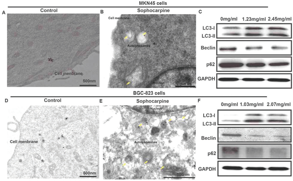 Figure 2Sophocarpine regulates cell autophagy of MNK45 and BGC-823 cell lines. (A&B) TEM images of MNK45 cells after incubation with or without sophocarpine for 48 h. (C) The expression of the LC3-I, LC3-II, Beclin and p62 proteins of the groups were detected by western blot in MNK45 cell lines, after the treatment of different concentrations of sophocarpine for 48 h. (D&E) TEM images of BGC-823 cells after incubation with or without sophocarpine for 48 h. (F) The expression of the LC3-I, LC3-II, Beclin and p62 proteins of the groups were detected by western blot in BGC-823 cell lines, after the treatment of different concentrations of sophocarpine for 48 h. Scale bar was 500 nm. Yellow arrows represented autolysosomes.