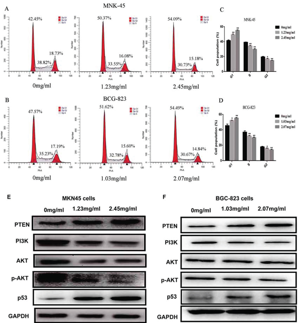 Figure 3Sophocarpine arrests GC cell cycle in G1 phase through PTEN/PI3K/AKT pathway. (A&B) The cell cycle images of MKN45 and BGC-823 cells treated with sophocarpine for 48 h. (C&D) The percentage of MKN45 and BGC-823 cells in G1, S and G2/M phases treated with sophocarpine for 48 h. (E&F) The expression of the PTEN, PI3K, AKT, p-AKT and p53 proteins of the groups were detected by western blot in MKN45 and BGC-823 cell lines treated with sophocarpine for 48 h. All data are shown as the mean ± SD of three independent experiments. *p < 0.05, **p< 0.0.1, or ***p< 0.001, versus the control group.