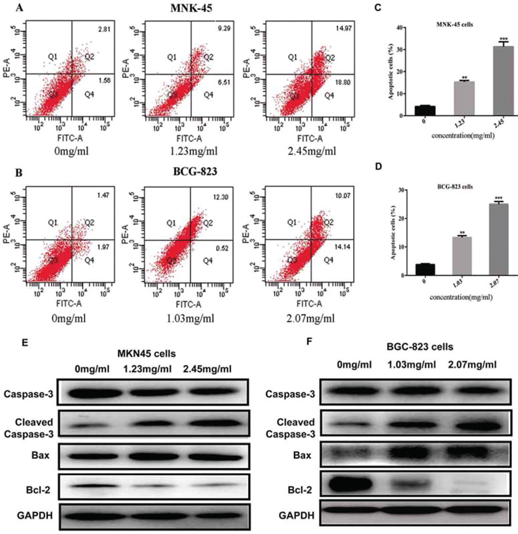 Consist with the flow cytometry, the expression of cleaved capase-3 and Bax proteins in groups treated with sophocarpine was significantly increased while Bcl-2 protein was conversely depressed in both MKN45 and BGC-823 cell lines (Figure 4C&-D). Taken together, these results showed that sophocarpine treatment could regulate the Caspase pathway in MKN45 and BGC-823 cell lines in dose-dependent.