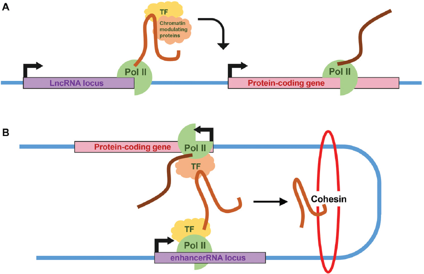 Figure 1Cis-regulation of local gene expression by lncRNAs. A. lncRNAs may influence chromatin architecture and/or transcription by interacting with transcription factors or chromatin-modulating proteins. B. Enhancer RNAs (eRNA) expanded the regulatory capacity of cis-regulatory lncRNAs by coordinating transcriptional activation or stabilizing enhancer-promoter looping. Pol II, RNA polymerase II; TF transcription factor.