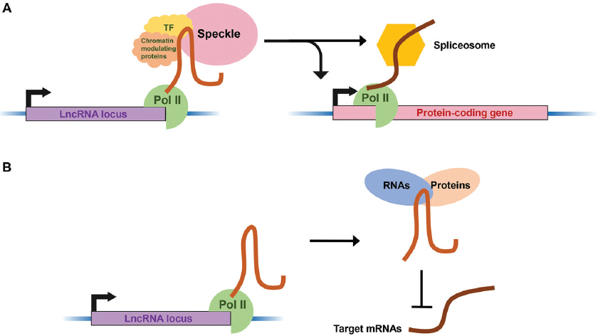 Figure 2Trans-regulation of unlinked gene expression by lncRNAs. A. lncRNAs may regulate distant gene expression by recruiting chromatin-modifying proteins, transcription factors and also by influencing nuclear structure to regulate DNA transcription, RNA processing. B. Trans-acting lncRNAs could interact with proteins and/or other RNA molecules. Pol II, RNA polymerase II; TF transcription factor.