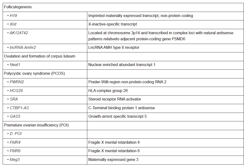 Folliculogenesis is a primary determinant of female fertility, and dysregulation of different steps in the process can lead to multiple female reproductive disorders such as infertility, miscarriage, and adverse pregnancy outcomes. LncRNAs have recently been explored as epigenetic regulators in the female reproductive system and have shed new light on the etiology of numerous reproductive disorders. Here we mainly focus on the current evidence for the involvement of lncRNAs in polycystic ovary syndrome (PCOS) and premature ovarian insufficiency (POI).