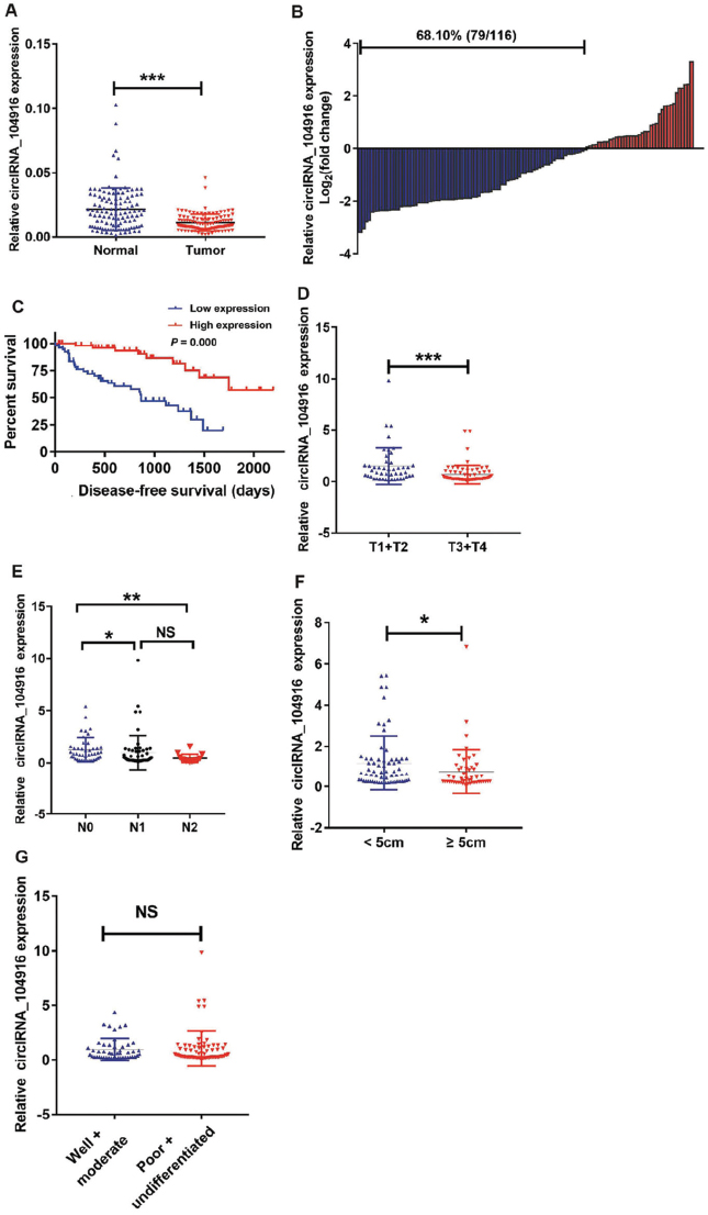 Figure 1Expression of circRNA_104916 in colorectal cancer and the correlation between its expression and clinicopathological parameters, as well as disease-free survival. (A) CircRNA_104916 was significantly downregulated in tumorous tissues compared with that in adjacent normal tissues detected using RT-qPCR assay (n=116). (B) Among the patients recruited, 68.1.0% (79/116) of them showed a decrease of circRNA_104916 in tumorous tissue than adjacent normal tissue (Log2 (2-ΔΔCT)). (C) Patients with higher circRNA_104916 expression (n=58) had a better disease-free survival than those with lower (n=58) revealed by Kaplan-Meier analysis. (D) The relative circRNA_104916 expression was lower in patients with T3 and T4 stage than those with T1 and T2 stage analyzed by Mann-Whitney U test. (E) The relative circRNA_104916 expression was lower in patients with lymphatic metastasis (N1 and N2) than those without lymphatic metastasis analyzed by Kruskal-Wallis test followed by Nemenyi test. (F) The relative circRNA_104916 expression was lower in patients with tumor diameters exceeded 5cm than those with less than 5cm analyzed by Mann-Whitney U test. (G) No significant difference of the relative circRNA_104916 expression was observed between patients with various differentiation degrees analyzed by Mann-Whitney U test. * P < 0.05, ** P < 0.01, *** P < 0.001, NS, not significant.