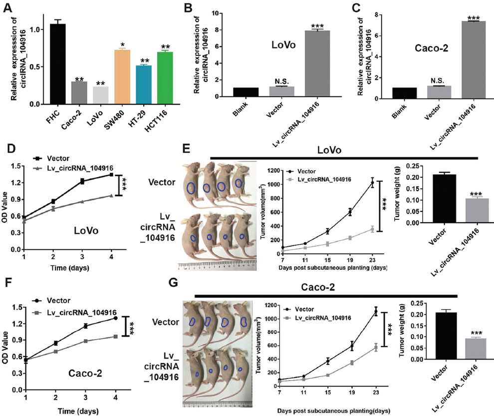 Figure 2Overexpression of circRNA_104916 inhibits proliferation of colorectal cancer cells in vitro and in vivo. (A) Expression of circRNA_104916 in a panel of colorectal cancer cell lines and the immortalized intestinal epithelial cell line, FHC, detected by RT-qPCR assay. (B and C) Successfully upregulation of circRNA_104916 by a lentivirus-based method in LoVo and Caco-2 cell lines. (D and E) The cell viability was significantly suppressed after overexpression of circRNA_104916 in LoVo (D) and Caco-2 (E) cell lines revealed by CCK-8 assay. (F and G) The growth rate and weight subcutaneously xenografted tumors in Lv_circRNA_104916 groups were suppressed than those of vector groups revealed by in vivo cell proliferation assay. * P < 0.05, ** P < 0.01, *** P < 0.001, NS, not significant.