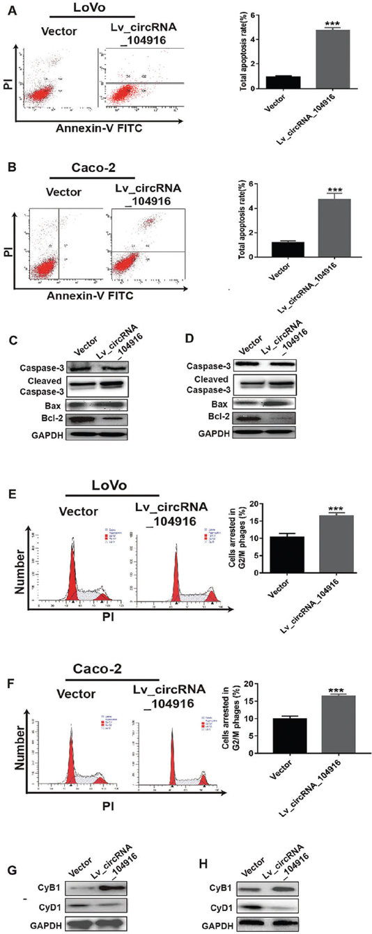 Figure 3Upregulation of circRNA_104916 promotes apoptosis and the alteration of cell cycle in colorectal cancer cell lines. (A and B) The percentage of apoptotic cells was significantly increased after overexpression of circRNA_104916 in LoVo (A) and Caco-2 (B) determined by FACS. (C and D) The change of apoptosis-related protein expression (Caspase-3, cleaved Caspase-3, Bax), and the anti-apoptotic protein, Bcl-2 detected by western blotting. (E and F) The number of G2/M phase cells was significantly increased after overexpression of circRNA_104916 in in LoVo (E) and Caco-2 (F) determined by FACS. (G and H) The expression of G2/M phase checkpoint protein cyclin B1 was upregulated, while the G1 phase checkpoint protein cyclin D1 decreased when circRNA_104916 was overexpressed determined by western blotting. *** P < 0.001.
