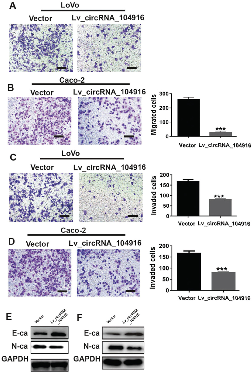 Figure 4CircRNA_104916 suppresses migration, invasion and process of epithelial–mesenchymal transition in colorectal cancer cell lines. (A and B) The number of migrated cells were significantly reduced in LoVo (A) and Caco-2 (B) cell lines measured by Transwell migration assay. (C and D) The number of invaded cells were significantly reduced in LoVo (C) and Caco-2 (D) cell lines measured by Transwell invasion assay. (E and F) The expression of the epithelial marker, E-cadherin (E-ca) was upregulated, and the mesenchymal marker, N-cadherin (N-ca) was downregulated after overexpression of circRNA_104916 in LoVo (E) and Caco-2 (F). *** P < 0.001.