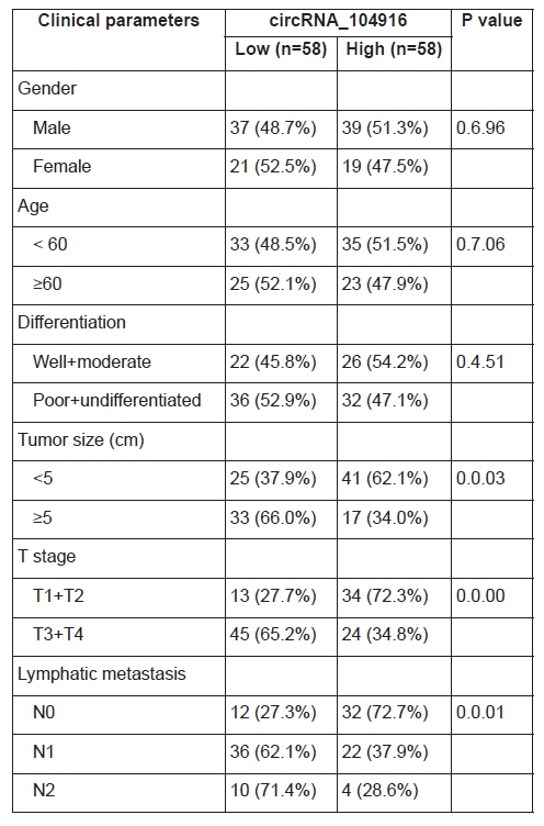 To evaluate the correlation between the relative circRNA_104916 expression and clinicopathological parameters, we divided the cohort into two groups as the median value (0.5.34). The chi-square tests (Table 1) showed that the relative circRNA_104916 expression was negatively correlated with tumor size (P = 0.0.03), T stage (P = 0.0.00) and lymphatic metastasis (P = 0.0.01), but no significant difference was observed between circRNA_104916 expression and other parameters (gender, age and differentiation degree). Furthermore, patients with higher degree of T staging (T1 + T2 versus T3 +T4; P <0.0.01; Figure 1D), those with lymphatic metastasis (N0 versus N1, P <0.0.5; N0 versus N2, P <0.0.1; Figure 1E), and those with larger tumor diameters (< 5cm versus ≥ 5cm, P < 0.0.5) inclined to have lower relative circRNA_104916 expression. And that patients in high circRNA_104916 group had a better performance for disease-free survival (DFS; could not determine the median value, yet) than those in low circRNA_104916 group (median, 865.0. ± 161.9. days) evaluated via Kaplan-Meier analysis (Figure 1C).