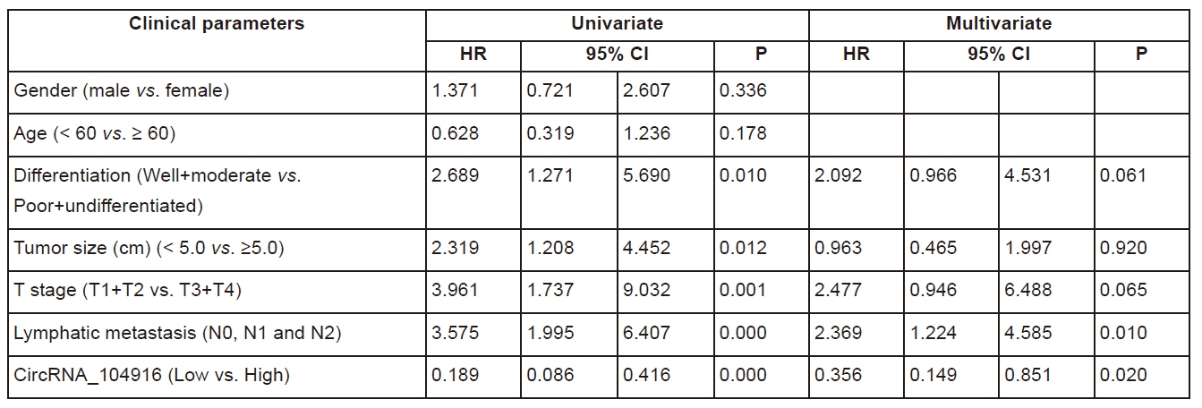 To measure the prognostic value of circRNA_104916 for DFS in patients with CRC, we established a COX proportional hazard model. Firstly, the univariate analysis showed that the relative circRNA_104916 expression, along with the differentiation degree, tumor size, T stage and lymphatic metastatic status, were significantly correlated with DFS in patients with CRC. Secondly, the multivariate analysis revealed that the relative circRNA_104916 expression and lymphatic metastatic status were able to independently predict patients’ prognosis (Table 2).