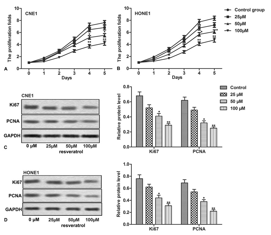 Figure 1.Resveratrol inhibits proliferation of NPC cells. NPC cells (CNE1, HONE1) were treated with different concentrations of resveratrol. (A-B) The cell proliferation was measured through CCK-8 assay. (C-D) Relative expression of Ki67 and PCNA was detected through western blot. The bars showed means ± SD of three independent experiments. *P < 0.0.5, **P < 0.0.1 compared with control group.