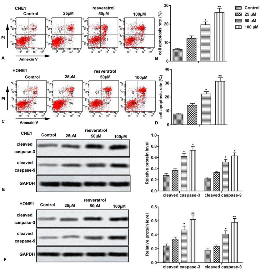 Figure 2.Resveratrol induces apoptosis of NPC cells. NPC cells (CNE1, HONE1) were treated with different concentrations of resveratrol. (A-D) Cellular apoptosis was detected by flow cytometric analysis. (E-F) Relative expression of cleaved caspase-3 and cleaved caspase-9 was detected through western blot. The bars showed means ± SD of three independent experiments. *P < 0.0.5, **P < 0.0.1 compared with control group.