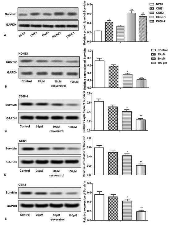 Figure 3.Resveratrol suppresses the expression of Survivin. (A-E) Relative expression of Survivin was detected through western blot assay. The bars showed means ± SD of three independent experiments. *P < 0.0.5, **P < 0.0.1 compared with NP69 or control group.