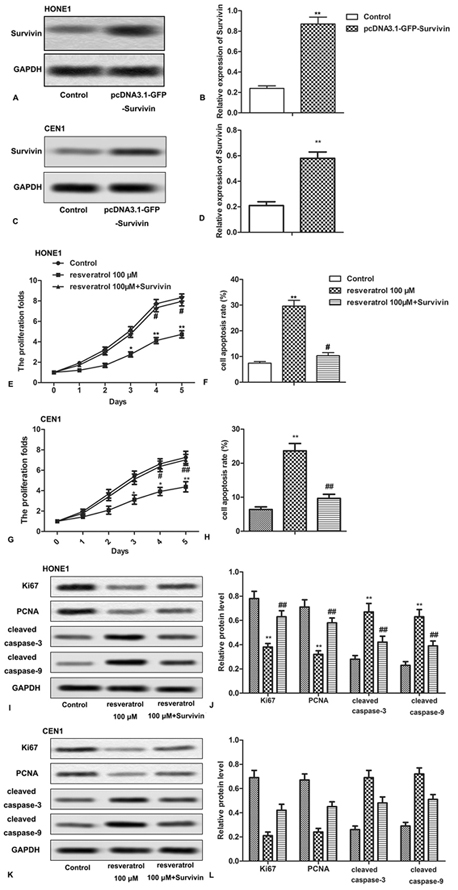 Figure 4.Overexpressed Survivin counteracts the effects of resveratrol in NPC cells. HONE1 and CEN1 cells were transfected with or without pcDNA3.1.-GFP-Survivin and received 100 μM resveratrol treatment. (A-D) Relative expression of Survivin was detected through western blot analysis. (E,G) The cell proliferation was measured through CCK-8 assay. (F,H) Cell apoptosis was detected by flow cytometric analysis. (I-L) Relative expression of Ki67, PCNA, cleaved caspase-3 and cleaved caspase-9 was detected through western blot assay. The bars showed means ± SD of three independent experiments. *P < 0.0.5, **P < 0.0.1 compared with control group. #P < 0.0.5 compared with resveratrol 100 μM group.