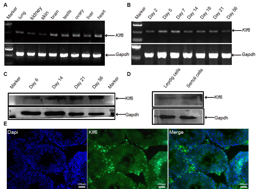 Figure 1.Expression of Klf6 in mouse testes. (A) Klf6 mRNA in various tissues of mice was analyzed with RT-PCR. Klf6 mRNA (B) and protein (C) level during testis development, from birth to adulthood (0-56 dpp). Gapdh mRNA and Gapdh protein was applied as internal control. (D) Klf6 protein level in Leydig cells and Sertoli cells. (E) Klf6 in adult mouse testes was examined by immunofluorescence staining. DAPI indicated the nucleus. Scale bar, 100 μm.