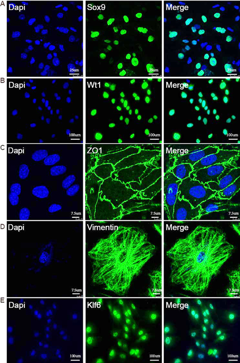 Figure 2.The expression of Klf6 in isolated SCs. (A, B) Isolated cells were characterized with SC specific markers Wt1 and Sox9 that were localized in the nucleus. (C) Immunostaining of tight junction marker Zo-1. (D) Immunostaining of cytoskeletal marker Vimentin. (E) Klf6 protein was localized in the nucleus of isolated primary SCs. Scale bar, 100 μm.