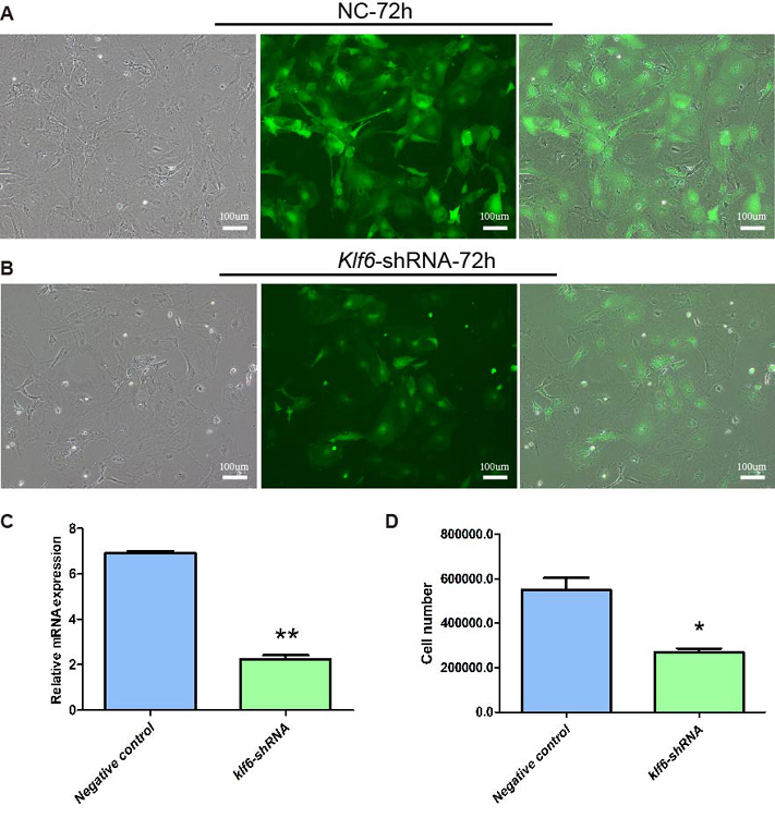 Figure 4.Knockdown of Klf6 by shRNA lentivirus infection. (A, B) SCs were infected with NC or Klf6-shRNA lentivirus for 72 hr. (C) Relative mRNA level of Klf6 was determined by quantitative RT-PCR. Gapdh mRNA was served as internal control. (D) Proliferation of SCs was reduced after transfection with Klf6 shRNA. Data was expressed as mean±SEM (n=3) and analyzed by student’s t-test. **P<0.01, *P<0.05.