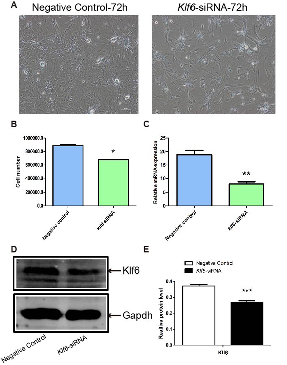 Figure 3.Knockdown of Klf6 and the proliferation and apoptosis of SCs. SCs were transfected with Klf6 siRNA or negative control siRNA for 72 hr. (A, B) Proliferation of SCs was reduced after transfection with Klf6 siRNA. (C, D) Klf6 mRNA and protein levels were quantified with quantitative RT-PCR and Western blot, respectively. Figure (E) was the statistical result of Figure (D). All the data were obtained from three independent experiments and analyzed by student’s t-test. **P<0.01, *P<0.05.
