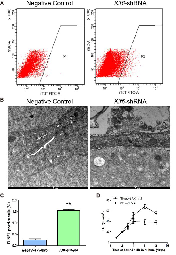 Figure 5.Klf6 regulated the integrity and permeability of BTB in SCs. (A) Apoptosis of SCs was increased after Klf6 silencing by flow cytometry. Figure (C) was the statistical result of Figure (A). (B) Electron microscopy assay indicated the complete BTB structure in the control group (White braces). The structure was disrupted in the Klf6-shRNA group and the edge of SCs appeared irregular. Scale bar, 1 μm. (D) The function of SC tight junction was examined daily by trans-epithelial electrical resistance (TER) from day 1 to 8 of culture. The solid circular was the negative control, and the solid cube was the Klf6-shRNA group, which was treated with Klf6 shRNA lentivirus in vitro. Data was expressed as mean±SEM (n=3) and analyzed by student’s t-test. **P<0.01, *P<0.05.