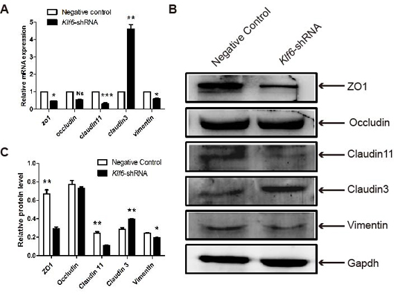 Kfl6 cDNA in eukaryotic expressing vector pFlag-CMV4 were obtained from Addgene (MA, USA). Promoters of claudin-3, vimentin and ZO-1 were amplified from mouse genomic DNA and then cloned into PGL4.17-Luciferase vector (Addgene, E6721). Klf6-expressing plasmids, promoter-luciferase plasmids, and internal control pRL-TK-Renilla (Promega, CA, USA) constructs were co-transfected into HEK293T cells on 96-well plates using lipofectamine 2000 (Invitrogen, CA, USA) following the manufacturer’s protocol. Cell extracts were prepared 48 hr after transfecting with the lysis buffer provided in the Dual-Luciferase Reporter Assay System kit (Vigorous Biotechnology, Beijing, China). Luciferase activity was measured on a Synergy Neo2 Multi-Mode Microplate Reader instrument (Bio-Tek, MA, USA) and the Renilla luciferase activity was applied to normalize the firefly luciferase activity.
