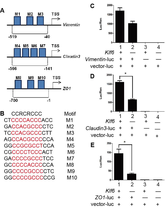Figure 7.Identification of Klf6 target genes with dual-luciferase assay. (A, B) Scheme of the proximal promoters containing predicted Klf6-binding sites for Vimentin (from -519 to -40 of the TSS), Claudin-3 (from -566 to -141 of the TSS), and Zo-1 (from -700 to -1 of the TSS). Sequences of predicted Klf6 motif and potential Klf6-binding sites in Vimentin (M1, M2, M3), Claudin-3 (M4, M5, M6, M7), and Zo-1 (M8, M9, M10) (in red) were listed. TSS: transcription start site. (C-E) Dual-luciferase assay indicated the significant activation of Claudin3 and Zo-1 promoter by transcription factor Klf6. Data was expressed as mean±SEM (n=3) and analyzed by student’s t-test. *P<0.05.