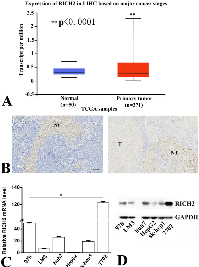 Figure 1.(A) In the TCGA dataset, RICH2 is downregulated in HCC tissues compared with that in normal tissues. (B) RICH2 protein IHC staining in HCC tissues. The staining is negative (left) or weaker (right) than that of the adjacent non-tumor cells. T: Tumor, NT: Non-tumor tissues. scale bars, 100 μm. (C) RICH2 expression as assessed by qPCR is lower in HCC cell lines as compared with that in normal liver cell line. (D) As assessed by WB, RICH2 is lower in HCC cell lines than in a normal liver cell.