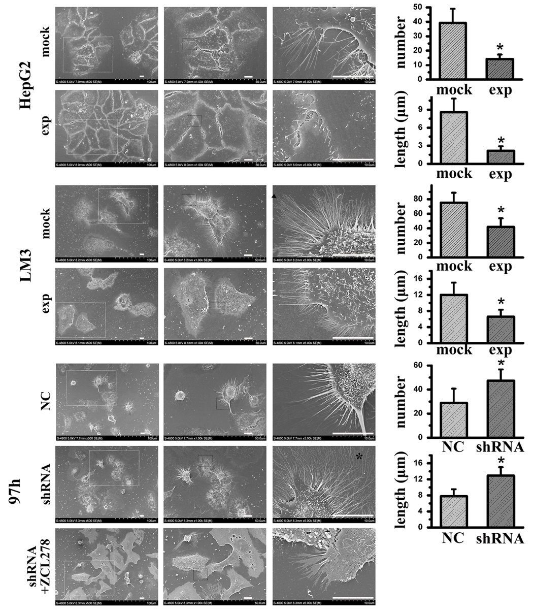 Figure 2.The filopodia are less abundant, are thinner and shorter in length after RICH2 overexpression in HepG2 and LM cells. However, filopodia are thicker and longer in 97h cells after RICH2 knockdown and such changes are reversed by the Cdc42-selective inhibitor ZCL278. scale bars, 10 μm. The white dashed rectangle in the left panel indicates the region in the middle panel that is magnified, and the black dashed rectangle in the middle panel shows the region in the right panel that is magnified. The black triangle shows a sucker-like structure in the terminus of the filopodia. The black asterisk shows a secondary filopodia branch.