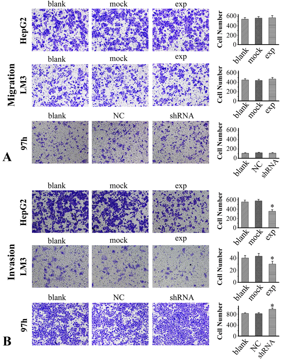 Figure 3.(A) Migration in HepG2 and LM3 cells that overexpress RICH2 and in 97h cells with RICH2 knockdown. (B) Invasion in HepG2 and LM3 cells that overexpress RICH2 and in 97h cells with RICH2 knockdown. The data represent the means ± SD from three independent experiments. Blank: cells with no transfection; Mock: cells transfected with empty pcDNA3.1 vector; NC: negative control group transfected with GFP lentiviral vectors. *p< 0.05.