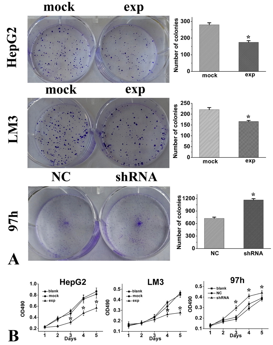 Figure 4.RICH2 inhibited HCC cell clone formation and proliferation in vitro. (A) Colony formation assays for evaluating the proliferation of HepG2, LM3, and 97h cells and count statistics for the colony formation assay. (B) MTT assays were performed. HepG2 and LM3 cells were transfected with a mock or RICH2 plasmid, and 97h cells were transfected with NC or shRNA. At the indicated time points, the numbers of cells per well were measured according to the absorbance (490 nm). The data are presented as the means ± SD. *p < 0.05.