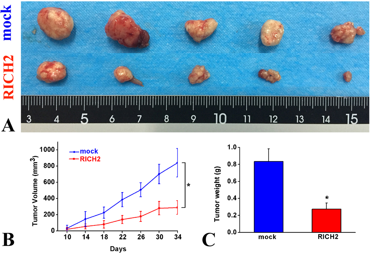 Figure 5.(A) Representative images showing the nude mouse tumors in the mock transfected and and RICH2-overexpressing group. (B) Tumor size. (C) Weights of tumors. The data are presented as the mean ± SD. n=5, *p< 0.05.