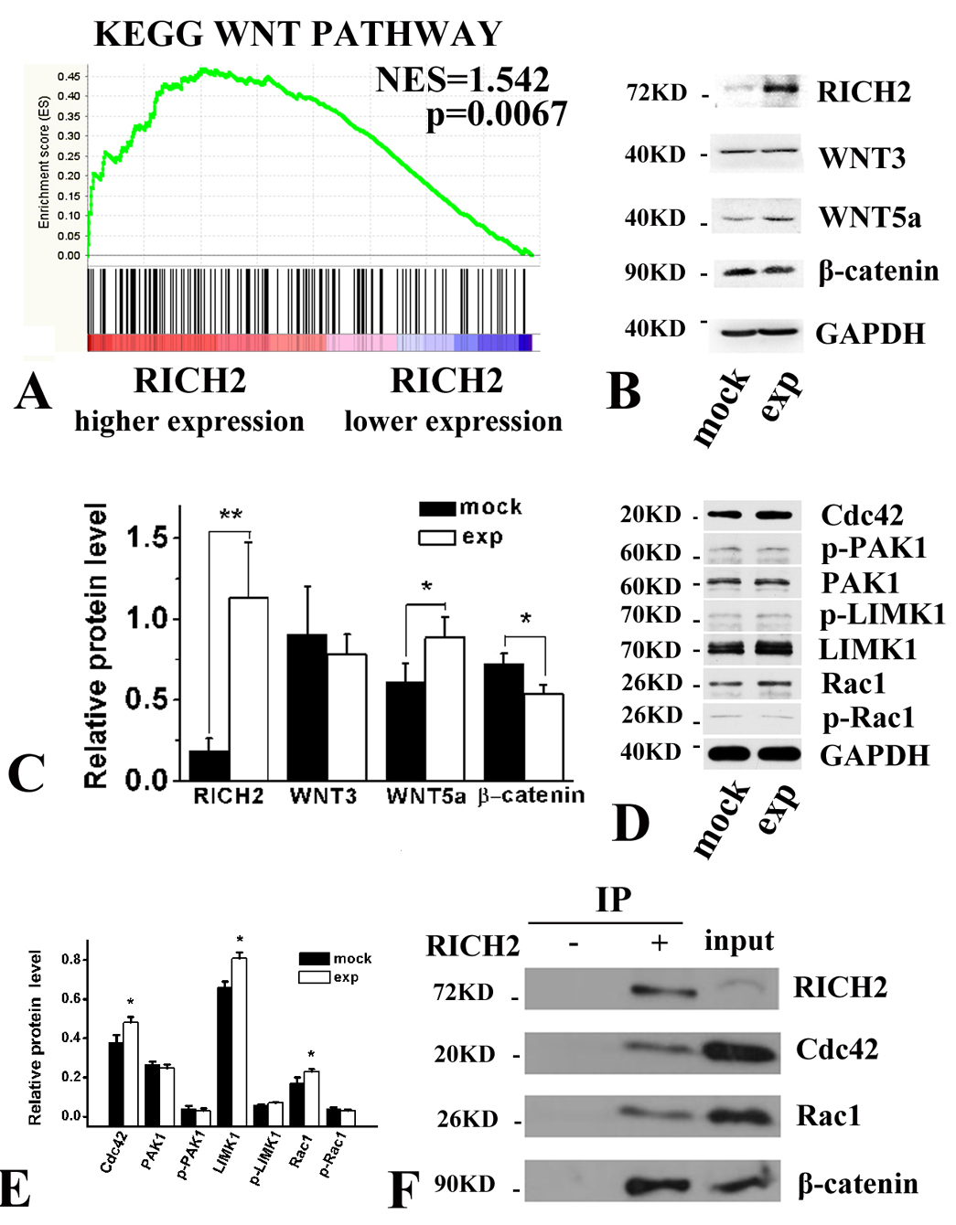 Figure 6.(A) GSEA of a TCGA hepatocellular carcinoma dataset reveals a strong association between RICH2 expression and the expression of the members of KEGG WNT pathway. (B) Western blotting of RICH2, WNT3, WNT5a, and β-catenin in RICH2-overexpressing LM3 cells. (C) Normalization of protein levels using GAPDH as the housekeeping control gene. (D) Western blotting of Cdc42, PAK1, p-PAK1, LIMK1, p-LIMK1, RAC1, and p-RAC1 in RICH2-overexpressing LM3 cells. (E) Normalization of protein levels using GAPDH as the housekeeping control gene. (F) Immunoprecipitation (IP) of Cdc42, Rac1, and β-catenin with Rich2 using a rabbit anti-Rich2 antibody in LM3 cells. The data shown as the mean± S.D. *p<0.05 were obtained in at least three independent experiments.
