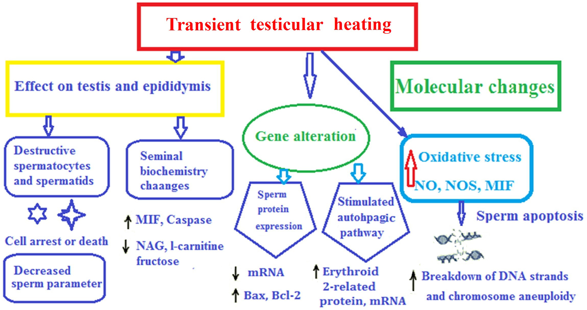 As a male contraceptive method, TTH has potential advantages and feasibility. Obvious changes are observed in testis, epididymis, sperm DNA, chromosomes, mRNA and protein expression, autophagy, oxidative stress and apoptosis of germ cells, and seminal plasma biochemistry after TTH. Sperm concentration, motility, normal morphology and acrosin activity during TTH are decreased, whereas sDF and chromosomal aneuploidy are increased. TTH is correlated with the generation of oxidative stress and ROS. The rate of sperm chromosomal aneuploidy is correlated with sperm concentration, motility, morphology, membrane, and DNA integrity, caspase-3 and acrosin activities. The alteration of sperm DNA, chromosomes, mRNA and protein expression, autophagy, oxidative stress, apoptosis and molecular biology after TTH may be caused by increased levels of NO, NOS and MIF or reduced levels of NAG and L-carnitin in seminal plasma. Given that TTH is a reversible process, and further studies are needed to design contraceptive methods based on TTH.
